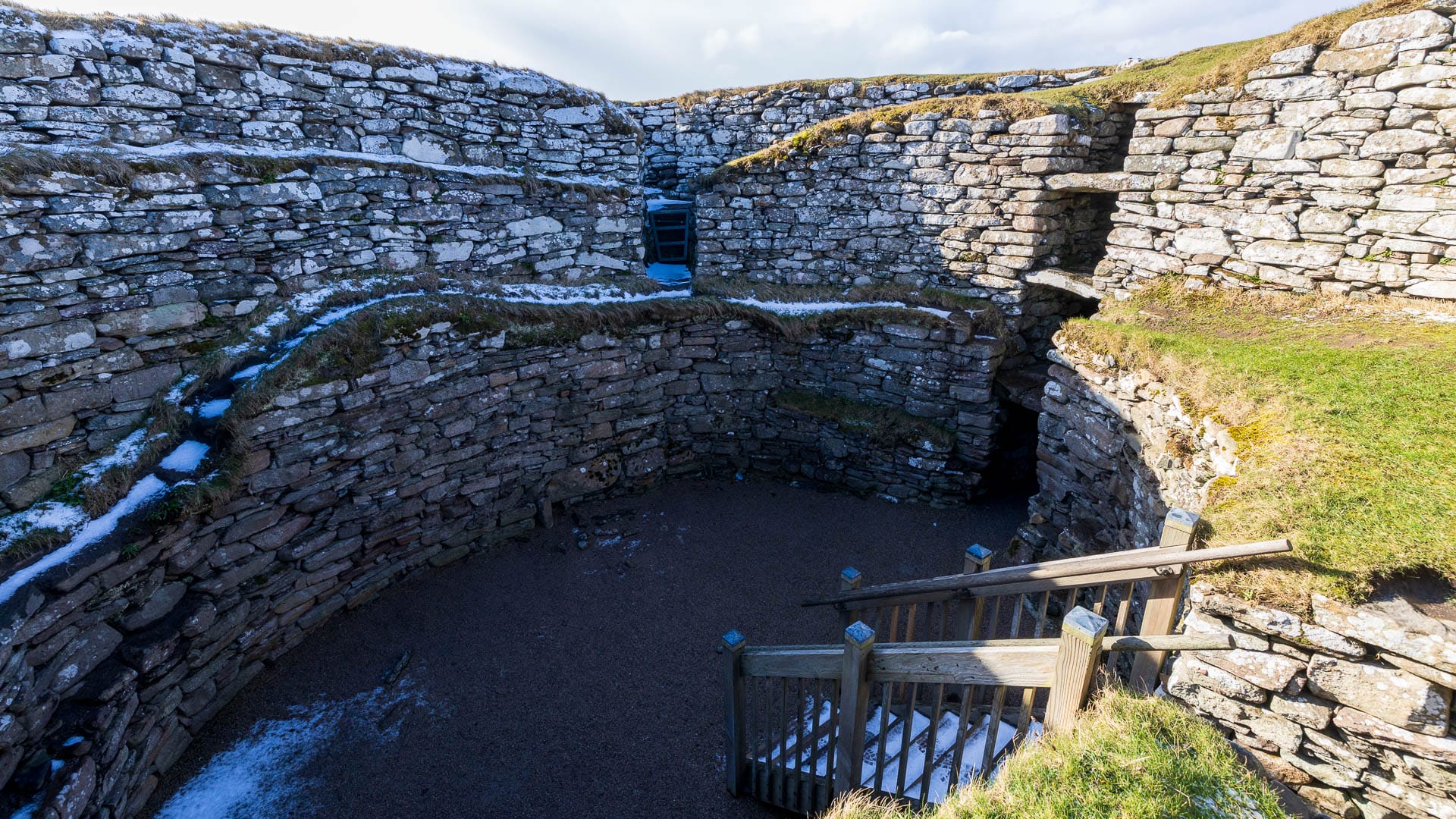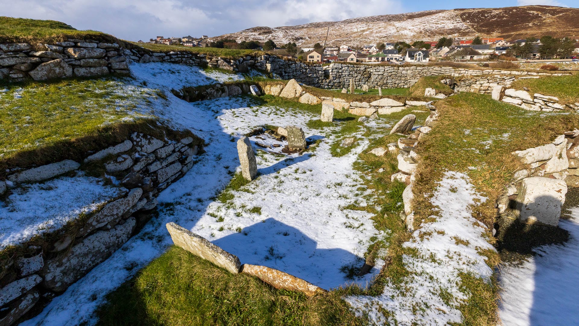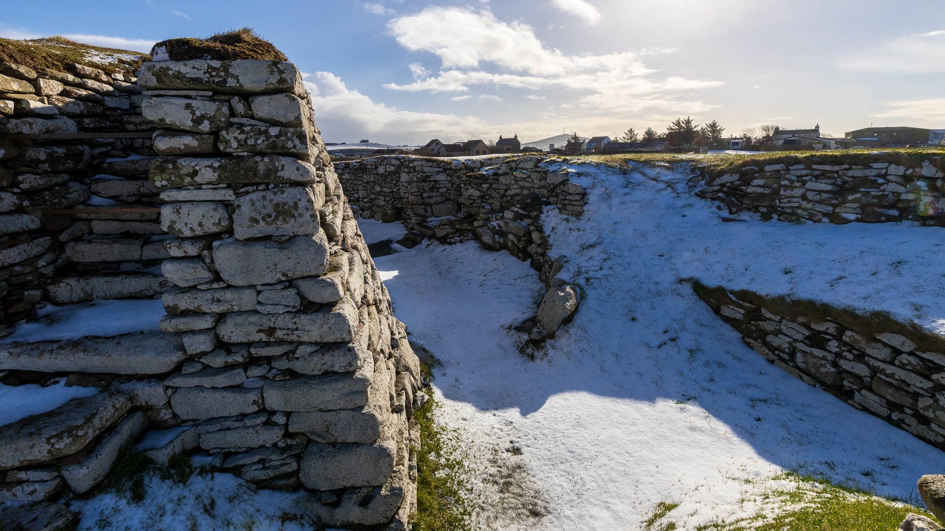 Um die Anlage spannt sich eine schützende Mauer, durch die früher nur ein Eingang führte. Dahinter fühlt es sich für heutige Besucher zunächst an, wie ein Labyrinth. Denn Clickimin hat – ähnlich wie auch der Jarlshof auf Shetland – verschiedene Epochen erlebt. Seit der Bronzezeit war die Insel bewohnt. Und so finden sich rund um das eigentliche Broch noch Überreste alter Häuser aus den verschiedenen Epochen.