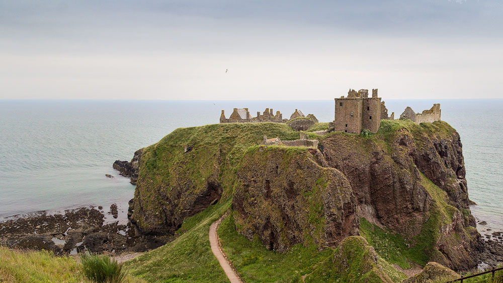 Ein wenig Puste muss man schon mitbringen. Denn wer auf die Dunnottar Castle will muss rund 200 Stufen erklimmen – und das jeweils auf dem Hin- und Rückweg. Was für heutige Besucher eine Herausforderung ist, war damals aber der beste Schutz vor Angreifern. Denn die Burganlage befindet sich auf einem Plateau, dessen Flanken 50 Meter steil abfallen zum Meer. Lediglich eine schmale Landzunge verbindet den Fels mit dem Festland, und die senkt sich zunächst ab, um dann wieder zum Burgtor anzusteigen.