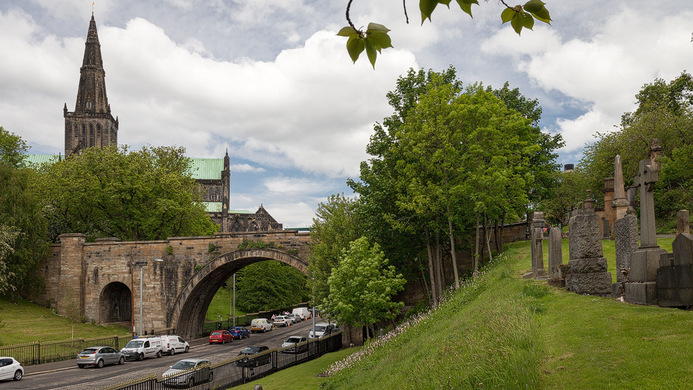Wait a minute: the bridge led over a stream? There’s nothing left of it today! That’s right, because not only people were buried at the Necropolis. The “Molendinar Burn” was also buried underground – in a canal under Wishart Street. It still flows there today as far as the River Clyde.