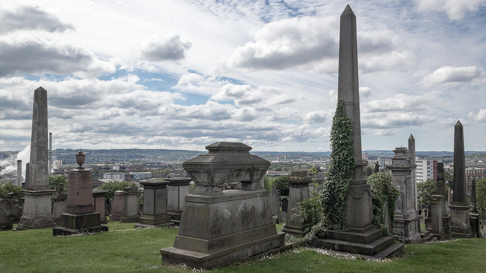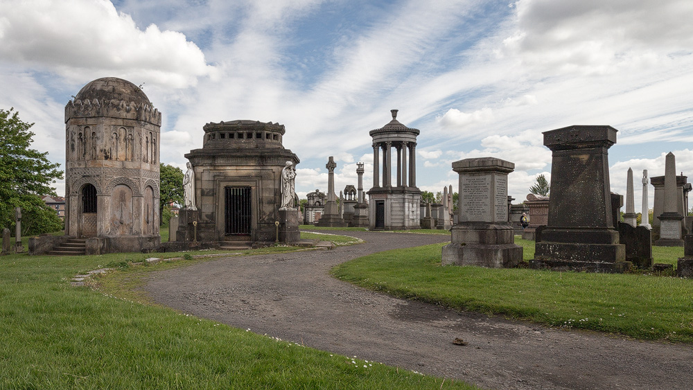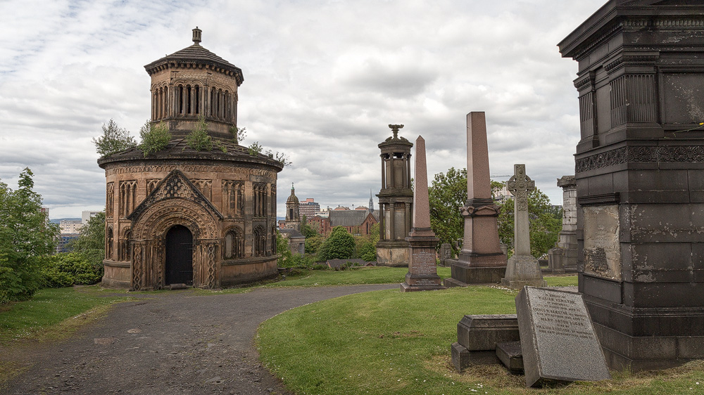 The fact that this cemetery in Scotland’s largest city is rightly popular is down to its beauty: old Victorian pavilions, crypts and monuments nestle against the hill known as “The Craigs”, with the column of the reformer John Knox crowning the scene at the very top – although he is not buried here.