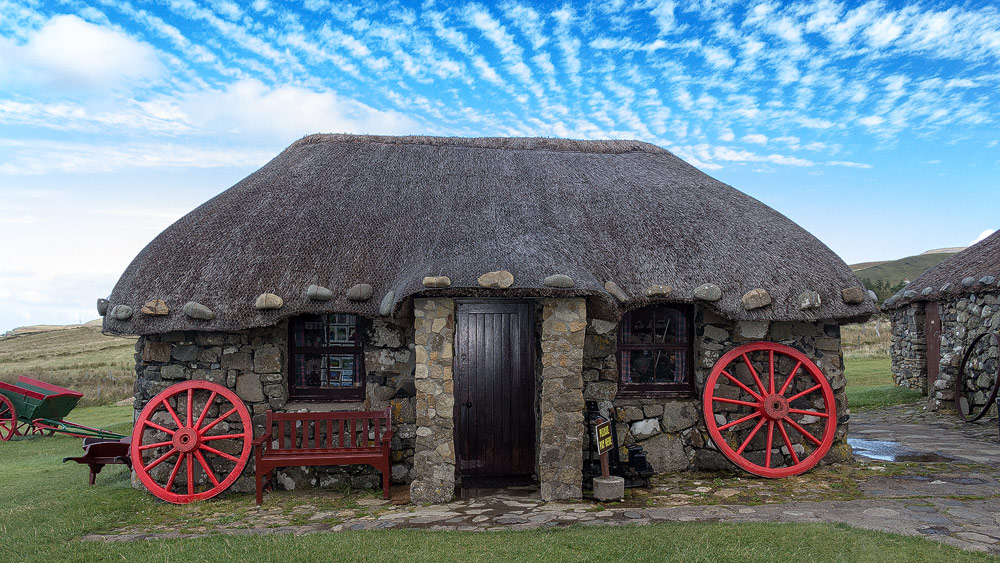 Dunkle, strohgedeckte Häuser ducken sich in die Landschaft von Skye. In ihrem Inneren ist es eng und es riecht nach Torffeuer. Das Skye Museum of Island Life zeigt seinen Besuchern eindrücklich, wie das Leben vor hundert Jahren hier war.