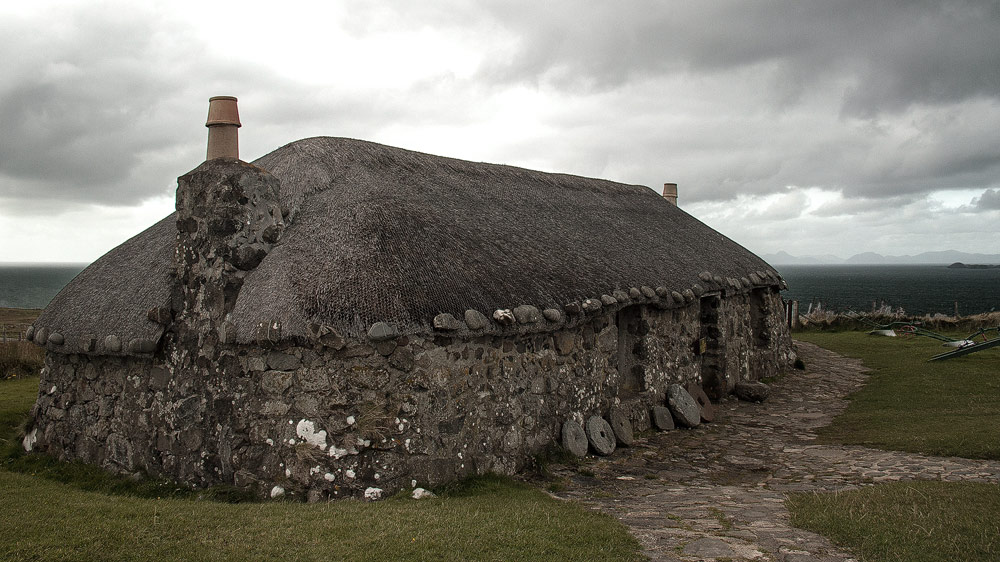 Die Blackhouses waren in den Highlands, und besonders auf den Hebriden, die traditionelle Behausung der Bauern, der sogenannten Crofters. Da sie nicht viel Geld hatten, griffen sie auf billiges Baumaterial zurück: Stein und Stroh. Für das Holz des Dachstuhls mussten sich die Erbauer schon etwas ausdenken – Skye war damals nicht bewaldet. So verließ man sich auf Treibholz, das an der Küste angeschwemmt wurde.