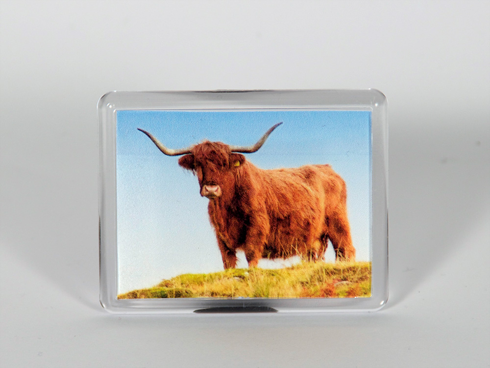 Stilvoller Magnet-Sticker mit einem Foto eines typischen Highland-Cattles aus Schottland. Das Bild ist in Acrylglas gefasst. Optimal für Kühlschrank und Magnettafeln. Natürlich sind auch hier wieder die Versandkosten im Preis enthalten.