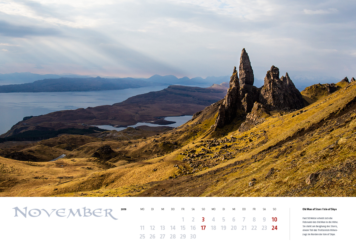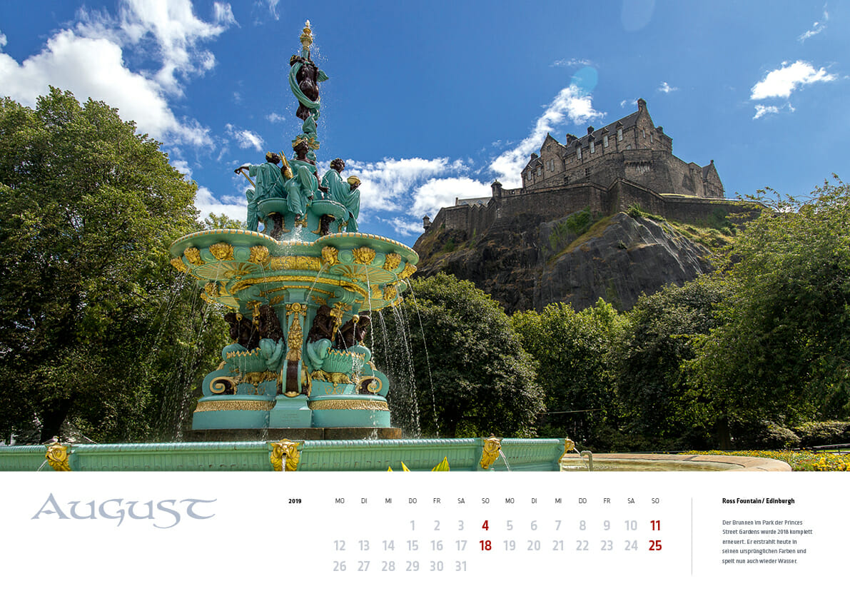 Der Schottland-Kalender 2019 auf DinA3. Motive: Der imposante Old Man of Storr, herrliche Highlands-Landschaften und die Ross Fountain in Edinburgh.