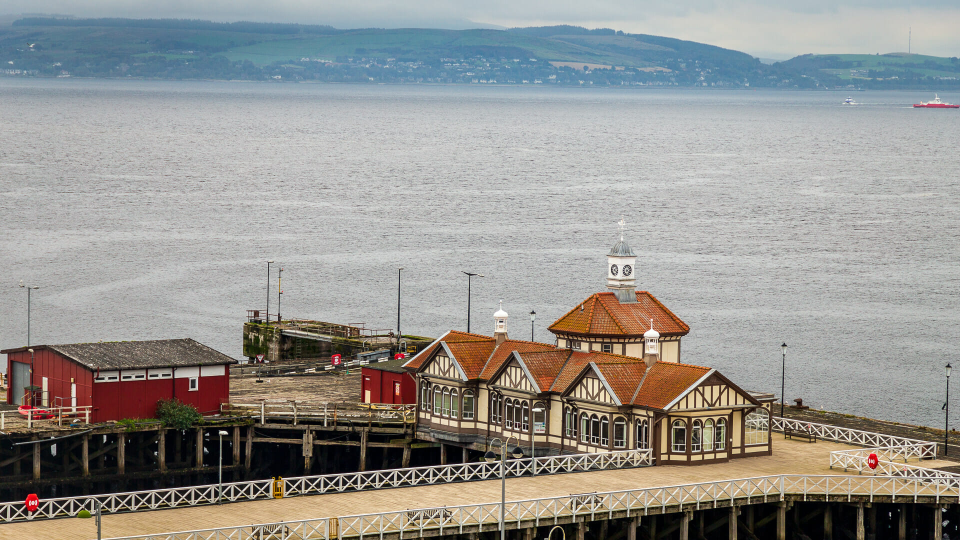 Da ist der alte Wartesaal mit seiner Fachwerkfassade und seinem roten Ziegeldach. Er stammt aus der Zeit Königin Victorias, erbaut zirka 1896, um dem Andrang an Passagieren standzuhalten, die im Sommer die Boote „Doon the watter“, also den Firth Clyde hinab, nahmen. Das Gebäude wurde erst kürzlich mit einem der beiden Stege renoviert und strahlt nun wieder.